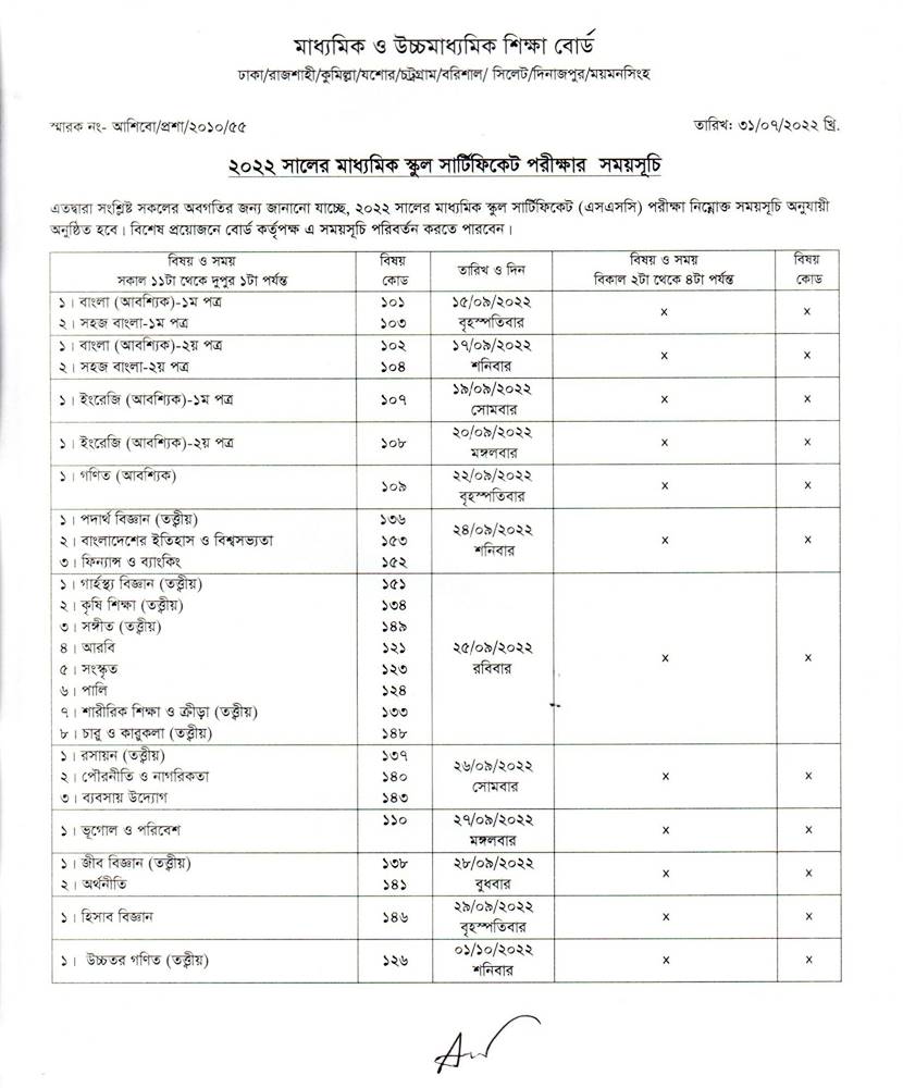 আগামী ১৫ সেপ্টেম্বর বাংলা (আবশ্যিক) প্রথমপত্র পরীক্ষার মাধ্যমে চলতি বছরের এসএসসি পরীক্ষা শুরু হবে। বাংলা (আবশ্যিক) দ্বিতীয়পত্র ও সহজ বাংলা দ্বিতীয়পত্র ১৭ সেপ্টেম্বর, ইংরেজি (আবশ্যিক) প্রথমপত্র ১৯ সেপ্টেম্বর এবং ইংরেজি (আবশ্যিক) দ্বিতীয়পত্রের পরীক্ষা ২০ সেপ্টেম্বর অনুষ্ঠিত হবে।