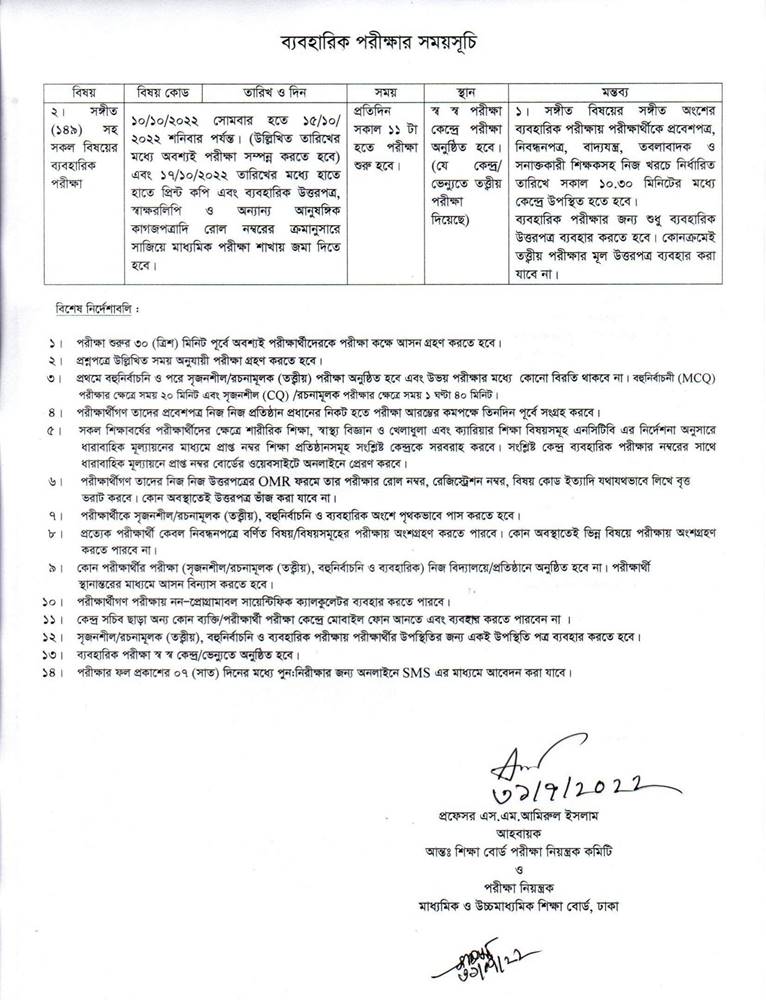 রসায়ন (তত্ত্বীয়), পৌরনীতি ও নাগরিকতা এবং ব্যবসায় উদ্যোগ ২৬ সেপ্টেম্বর; ভূগোল ও পরিবেশ ২৭ সেপ্টেম্বর; জীববিজ্ঞান (তত্ত্বীয়) এবং অর্থনীতি পরীক্ষা ২৮ সেপ্টেম্বর নেওয়া হবে। এছাড়া হিসাববিজ্ঞান ২৯ সেপ্টেম্বর এবং উচ্চতর গণিত (তত্ত্বীয়) বিষয়ের পরীক্ষায় বসতে হবে ১ অক্টোবর।