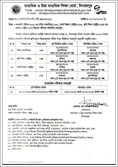 বৃহস্পতিবার (২২ সেপ্টেম্বর) দিনাজপুর শিক্ষা বোর্ডের চেয়ারম্যান অধ্যাপক মো. কামরুল ইসলাম বিষয়টি নিশ্চিত করেছেন।