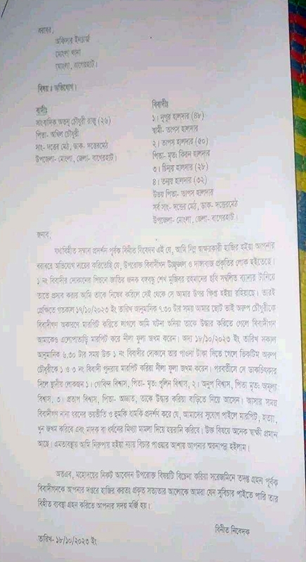 অন্য ১৮/১০/২০২৩ তারিখ আনুমানিক ৬.৩০ টার সময় উক্ত ১ নং বিবাদীর দোকানে তার পাওনা টাকা দিতে গেলে ভিকটিম অরুপ চৌধুরীকে ১ ও ৩ নং বিবাদী পুনরায় মারপিট করিয়া নীলা ফুল জখম করেন। পরবর্তী অরূপ চৌধুরী’কে স্থানীয় লোকজন ১। গোবিন্দ বিশ্বাস, পিতা- মৃত পুলিন বিশ্বাস, ২। অনুপ বিশ্বাস, পিতা মৃত: অমূল্য বিশ্বাস, ৩। প্রতাপ বিশ্বাস, পিতা- অজ্ঞাত, তাকে উদ্ধার করিয়া বাড়িতে নিয়ে আসেন। আসার সময় বিবাদীগণ নানা ধরনের ভয়ভীতি ও হুমকি ধামকি প্রদর্শণ করে যে, আমাদের সুযোগ পাইলে মারপিট, হত্যা, খুন জখম করিবে এবং মাদক বা ধর্ষনের মিথ্যা মামলা দিয়ে হয়রানি করিবে। উক্ত বিষয়ে অনেক স্বাক্ষী প্রমান আছে। এমতাবস্থায় আমি নিরুপায় হইয়া ন্যায় বিচার পাওয়ার আশায় আপনার স্মরনাপন্ন হইলাম।