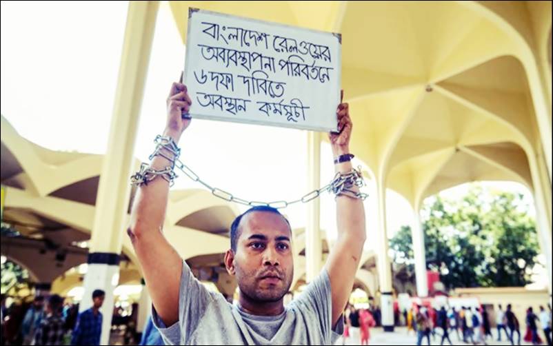 গত ৭ জুলাই থেকে রেলওয়ের অব্যবস্থাপনা-যাত্রী হয়রানির প্রতিবাদে ছয় দফা দাবিতে হাতে শিকল বাঁধা অবস্থায় কমলাপুর রেলস্টেশনে অবস্থান করছেন ঢাকা বিশ্ববিদ্যালয়ের থিয়েটার অ্যান্ড পারফরম্যান্স স্টাডিজ বিভাগের চতুর্থ বর্ষের শিক্ষার্থী মহিউদ্দিন রনি।