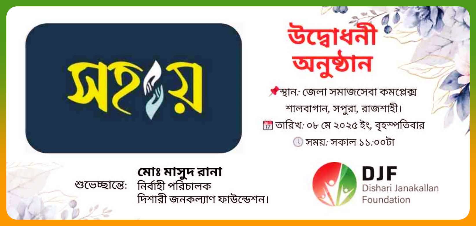 রাজশাহীর পিছিয়ে পড়া ক্ষুদ্র ব্যবসায়ী ও তরুণ উদ্যোক্তাদের আর্থসামাজিক ক্ষমতায়নে দিশারী জনকল্যাণ ফাউন্ডেশনের উদ্যোগে একটি ব্যতিক্রমধর্মী প্রকল্প “সহায়” আগামী ৮ মে আনুষ্ঠানিকভাবে উদ্বোধন হতে যাচ্ছে।