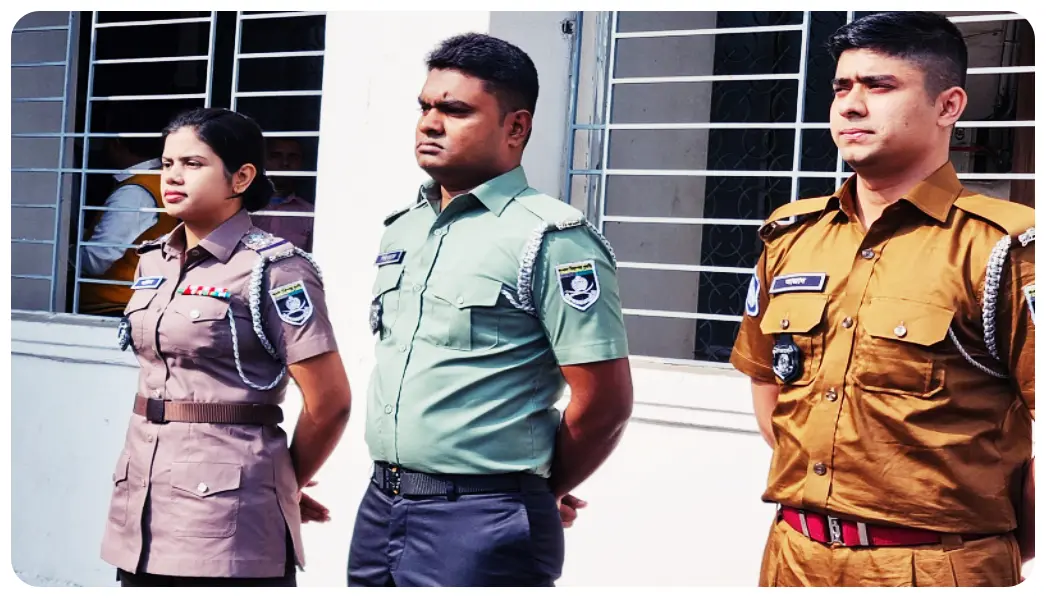 বাঁ পাশে দাঁড়ানো নারীর পোশাক হবে পুলিশের। মাঝে দাঁড়ানো ব্যক্তির পোশাক হবে র্যাবের আর ডানে দাঁড়ানো ব্যক্তির পোশাক হবে আনসারের। ছবি: সংগৃহীত