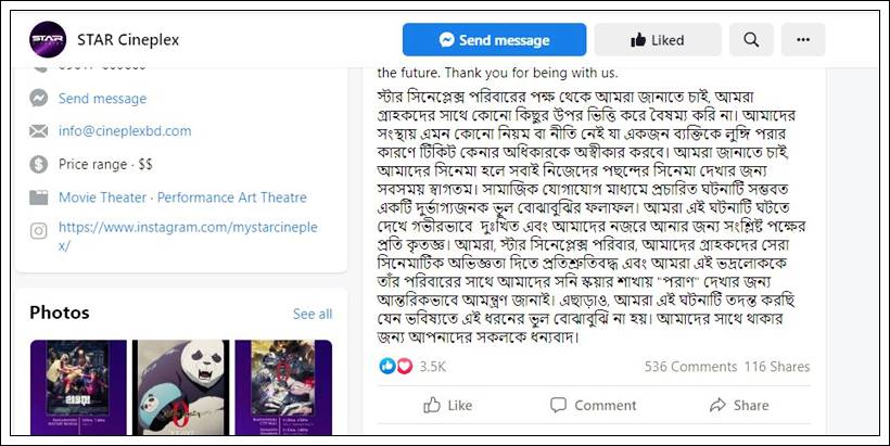 ওই বৃদ্ধকে সিনেমা দেখার আমন্ত্রণ জানিয়ে পোস্টে বলা হয়, আমরা স্টার সিনেপ্লেক্স পরিবার, আমাদের গ্রাহকদের সেরা সিনেমেটিক অভিজ্ঞতা দিতে প্রতিশ্রুতিবদ্ধ এবং আমরা এই ভদ্রলোককে তার পরিবারের সাথে আমাদের সনি স্কয়ার শাখায় ‘পরাণ’ দেখার জন্য আন্তরিকভাবে আমন্ত্রণ জানাই। এছাড়াও, আমরা এই ঘটনাটি তদন্ত করছি যেন ভবিষ্যতে এই ধরনের ভুল বোঝাবুঝি না হয়। আমাদের সাথে থাকার জন্য আপনাদের সকলকে ধন্যবাদ।’