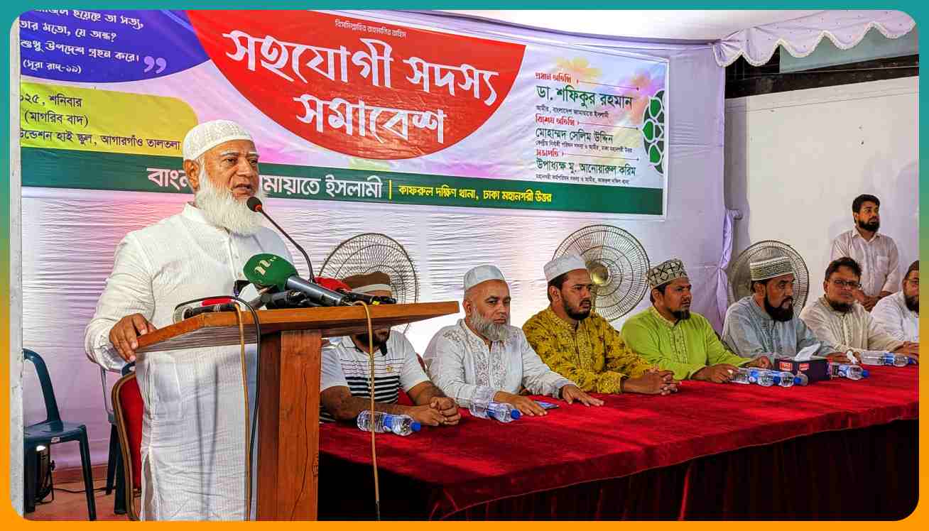 তিনি আজ সন্ধ্যায় রাজধানীর কাফরুলের তালতলা হালিম ফাউন্ডেশন স্কুল মাঠে কাফরুল দক্ষিণ থানা জামায়াত আয়োজিত সহযোগী সদস্য সমাবেশে প্রধান অতিথির বক্তব্যে এসব কথা বলেন। থানা আমীর উপাধ্যক্ষ আনোয়ারুল করিমের সভাপতিত্বে ও সেক্রেটারি মুহাম্মদ আবু নাহিদের সঞ্চালনায় সমাবেশে বিশেষ অতিথির বক্তব্য রাখেন কেন্দ্রীয় নির্বাহী পরিষদ সদস্য ও ঢাকা মহানগরী উত্তরের আমীর মোহাম্মদ সেলিম উদ্দিন।