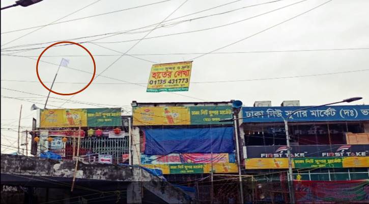 মার্কেটের ছাদে সাদা পতাকা লাগাচ্ছেন ব্যবসায়ীরা। ছবি: ইত্তেফাক