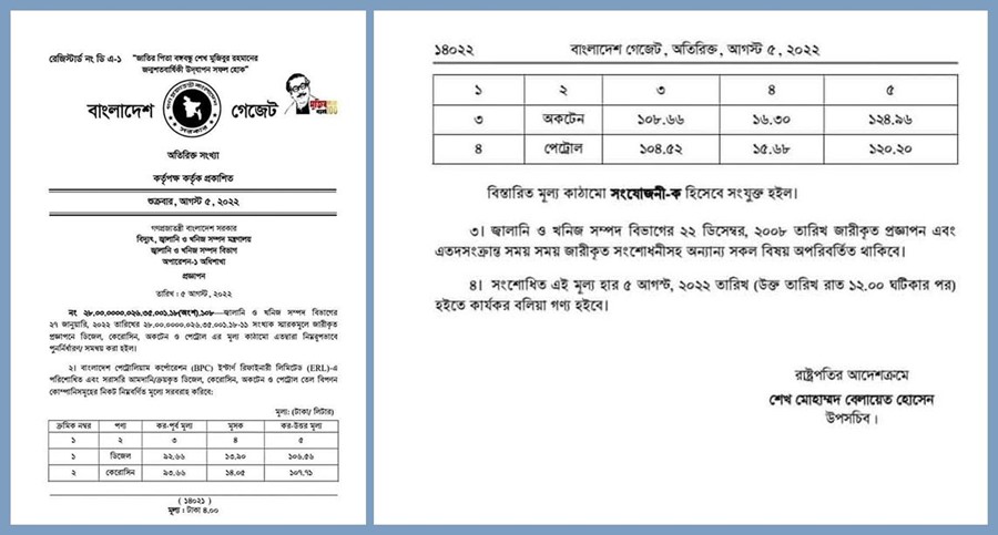 প্রজ্ঞাপনে বলা হয়, বৈশ্বিক বর্তমান প্রেক্ষাপটে বিশ্ববাজারে জ্বালানি তেলের মূল্য বাংলাদেশের তুলনায় অনেক বেশি হওয়ার কারণে বাংলাদেশ প্রেট্টোলিয়াম কর্পোরেশন (বিপিসি), ইস্টার্ণ রিফাইনারী লিমিটেড(ই আর এল)-এ পরিশোধিত এবং আমদানি/ক্রয়কৃত ডিজেল, কেরোসিন, অকটেন ও পেট্টোল এর মূল্য সমন্বয় করে ভোক্তা পর্যায় নিম্নোক্তভাবে পুণঃনির্ধারণ করা হলো।